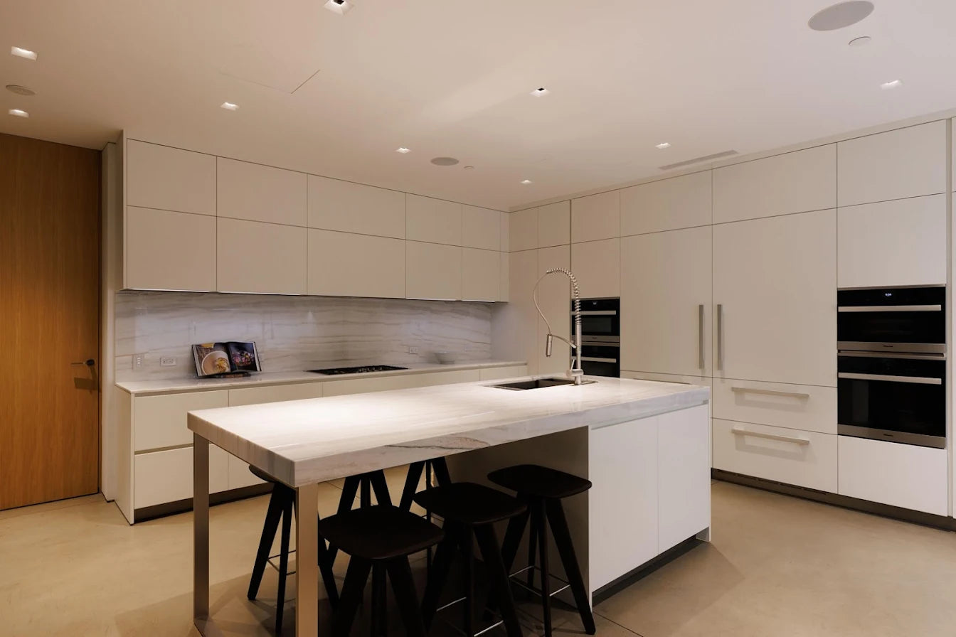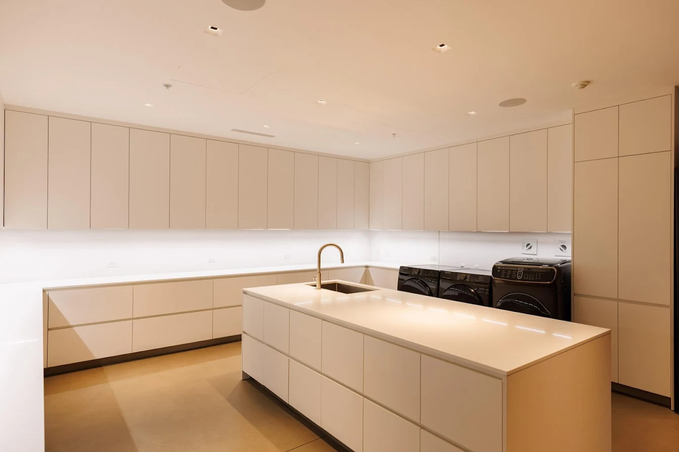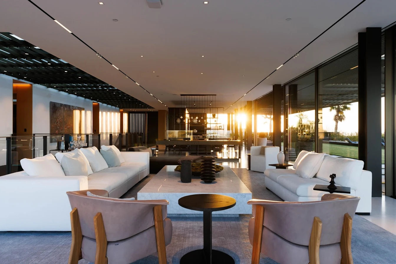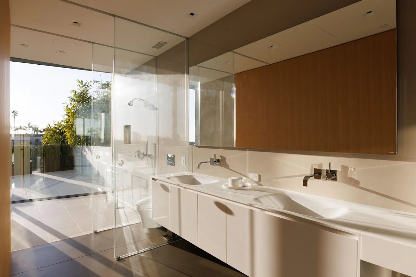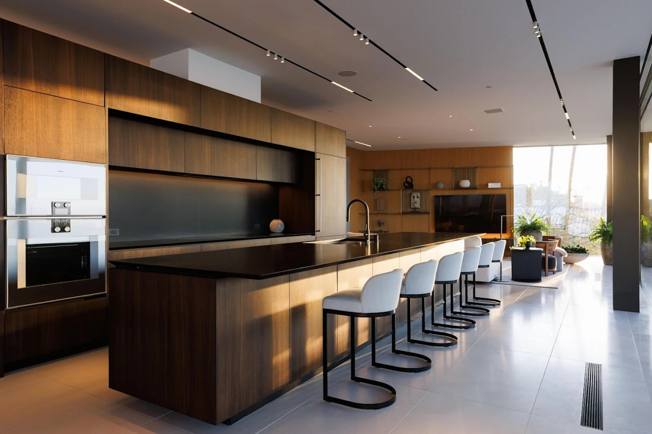 Automated pocket doors extend the living areas to the outdoors, enhancing the sense of openness and flow. The property houses two state-of-the-art Polyform kitchens, designed to accommodate both everyday dining and elaborate entertaining, alongside inviting living spaces and a dedicated media room for immersive viewing experiences.