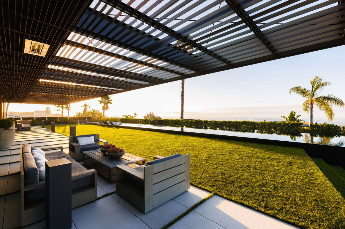 Outside, a lavish resort-style oasis unfolds with a sprawling yard perfect for gatherings and leisure, a sleek infinity pool complete with a Baja shelf for lounging, a heated spa, and an elegant fire pit lounge ideal for evening retreats.