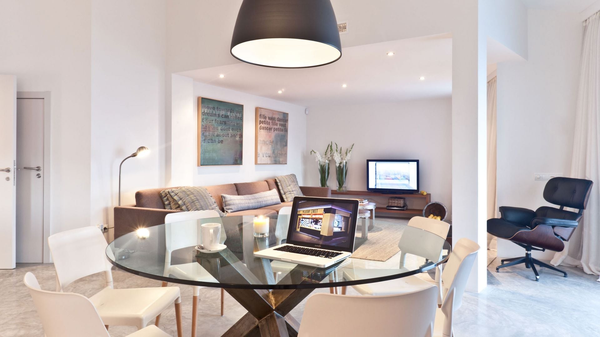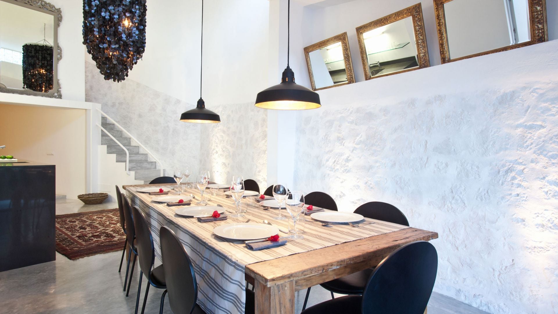 Outdoor entertaining is elevated through thoughtfully positioned zones that transition seamlessly from intimate gathering spaces to expansive terrace areas. The modest yet refined pool serves as a focal point, offering respite during Ibiza's warm months whilst maintaining the property's aesthetic coherence.